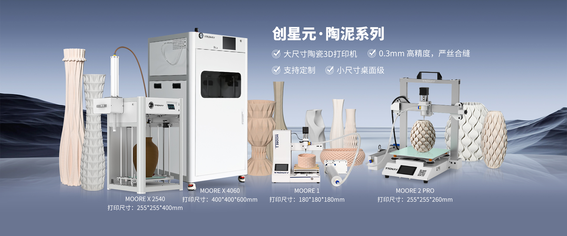 自主設計,定制生產線,可生產從桌面級到工業級等 尺寸從180mm到1.6米的3D打印機